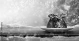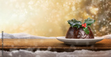 Christmas banner background of a traditional Christmas pudding on the right with a sprig of holly on top with a golden blurred background.
