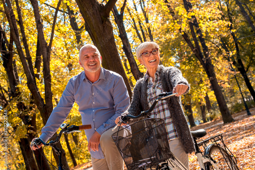 Happy senior man and woman enjoying riding a bike together in autumn park