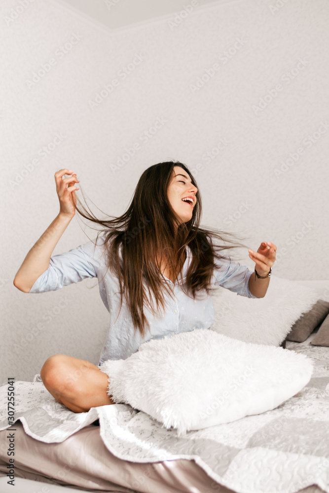 Young smiling woman doing workout on bed in her bedroom. Happy morning.