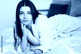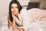 Young smiling woman lying in white bed and using a phone in her bedroom. Happy morning.