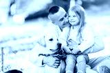Happy father and daughter with dog labrador is having fun are sitting on green grass in park.