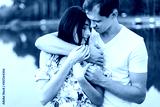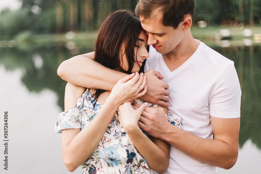 Young loving couple hugging near lake on sunset.