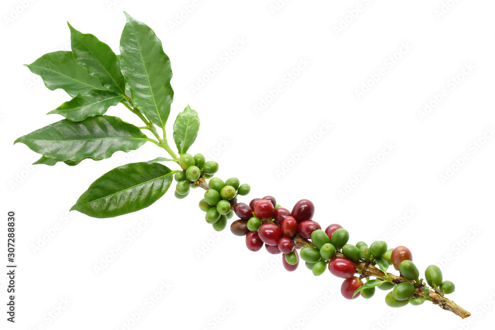 Coffee berry and leaves coffee on branch, White background.