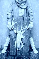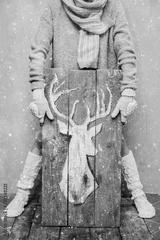woman dressed for winter with white knitted fashion items holds a wooden poster with painted white deer gray background.