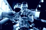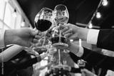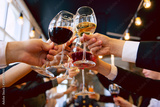Happy co-workers celebrating while company party and corporate event. Young caucasian people in business attire cheering, laughting. Concept of office culture, teamwork, friendship, holidays, weekend.