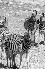 A group of Burchell's Plains zebra -Equus quagga burchelli- standing close to each other on the plains of Etosha National Park, Namibia.
