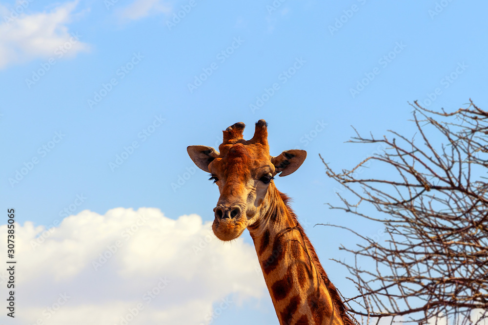 Wild african animals. Closeup namibian giraffe on natural sky background