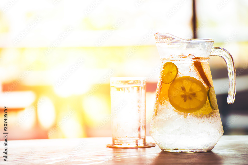 the fruit in the water and ice is on the table. the water in glass near jar.