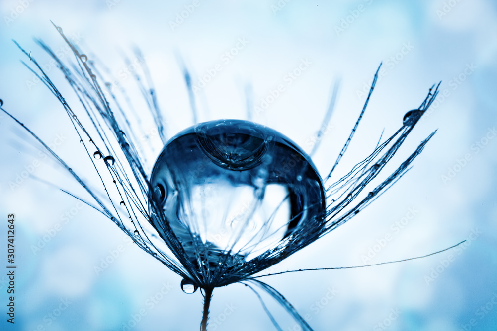 Beautiful dew drops on a dandelion seed. Macro. Beautiful soft light blue and violet background. Selective focus. Background with copy space.