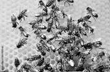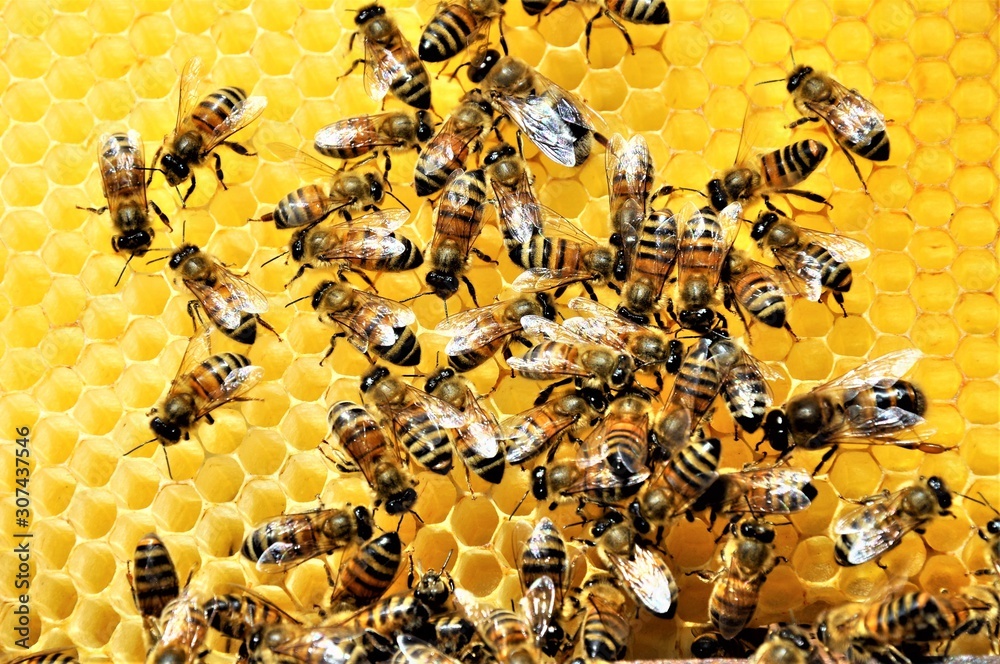Closeup shot of a group of bees creating a honeybee full of delicious honey