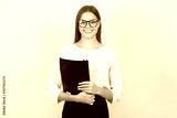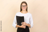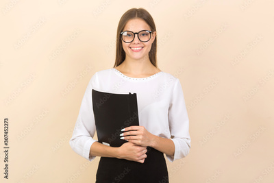 beautiful young woman in glasses on a beige background with a folder in her hands