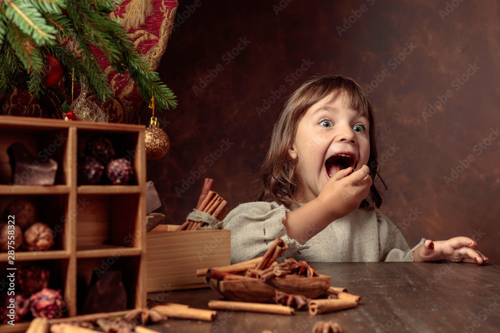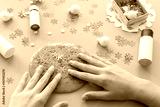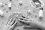 a girl making slime herself. child making slime on blue Christmas background.