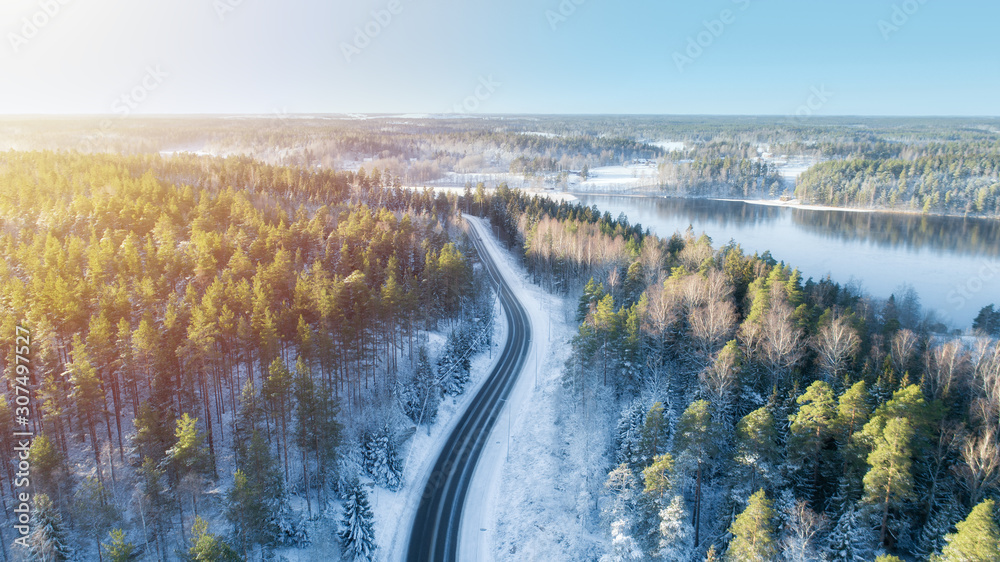 White car drives empty road running along the beautiful blue lake in the cold Finnish winter. Tourists on road trip cruising through the idyllic snow covered countryside and woods.