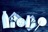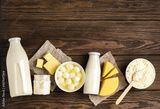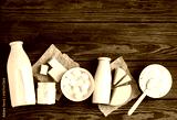 Dairy sour milk products on a wooden dark rustic background. Milk, kefir, yogurt, butter, cheese assortment. Flat layout