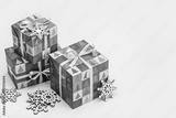 Gifts for Christmas and New Year in beautifully packed boxes. Winter holiday, snowflakes, copy space.