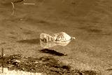 Plastic mineral water bottle junk floating on water in nature.