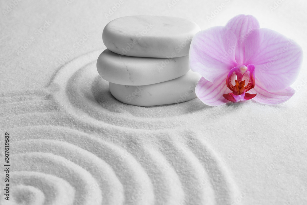 Stack of white stones and beautiful flower on sand with pattern. Zen, meditation, harmony