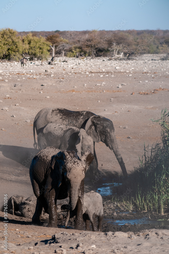 A family of African Elephants -Loxodonta Africana- walking around a waterhole. Etosha National Park, Namibia.