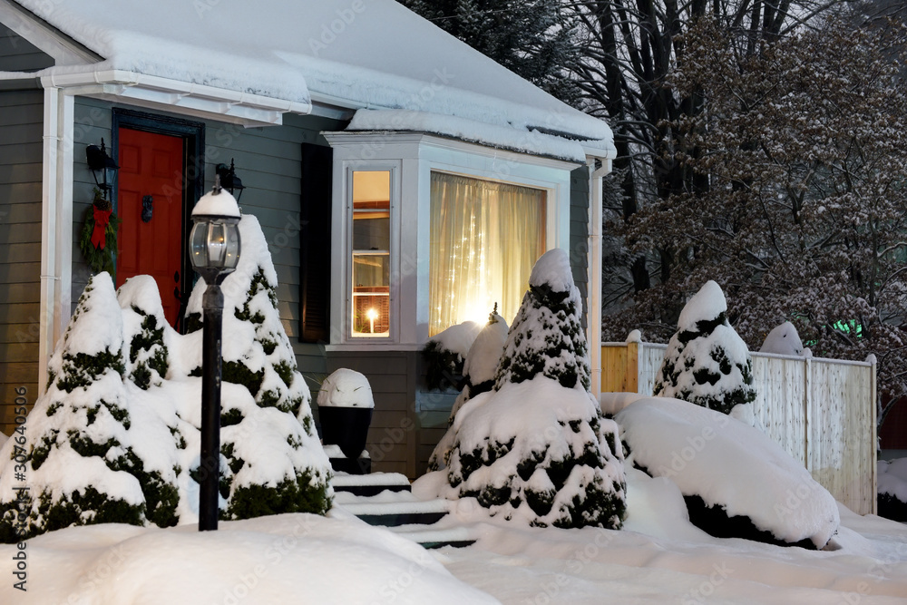Real Christmas trees festively decorated with New Year and Christmas garlands and toys on the threshold of a simple house on a snowy winter evening. USA. Maine