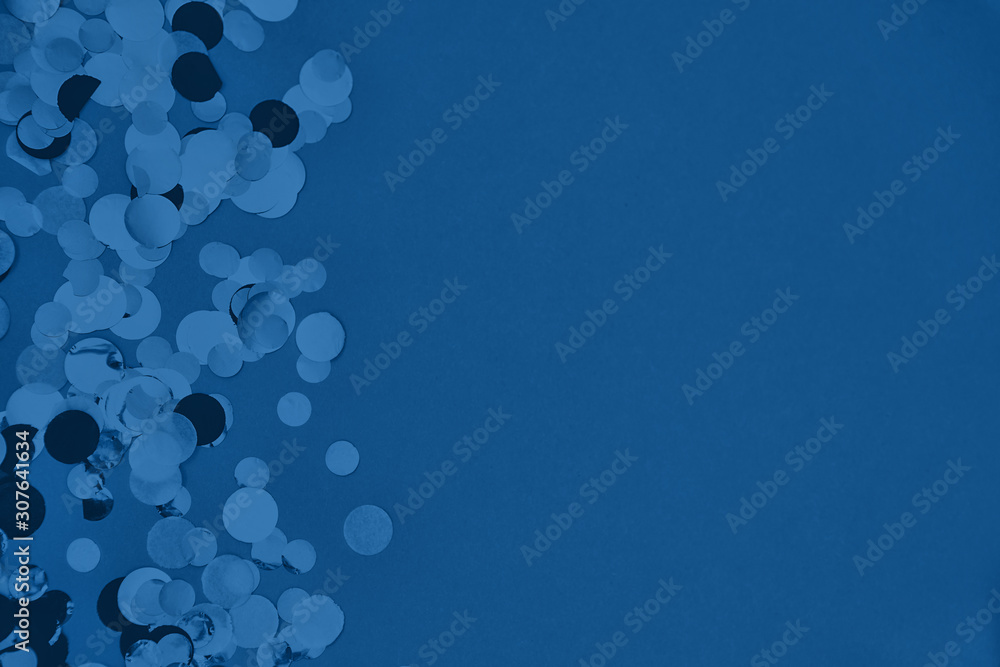 Paper and foil confetti sparse on trendy classic blue colored background. Simple holiday concept. Design template. Border frame with copy space for text. Top view, flat lay. Color of the year 2020