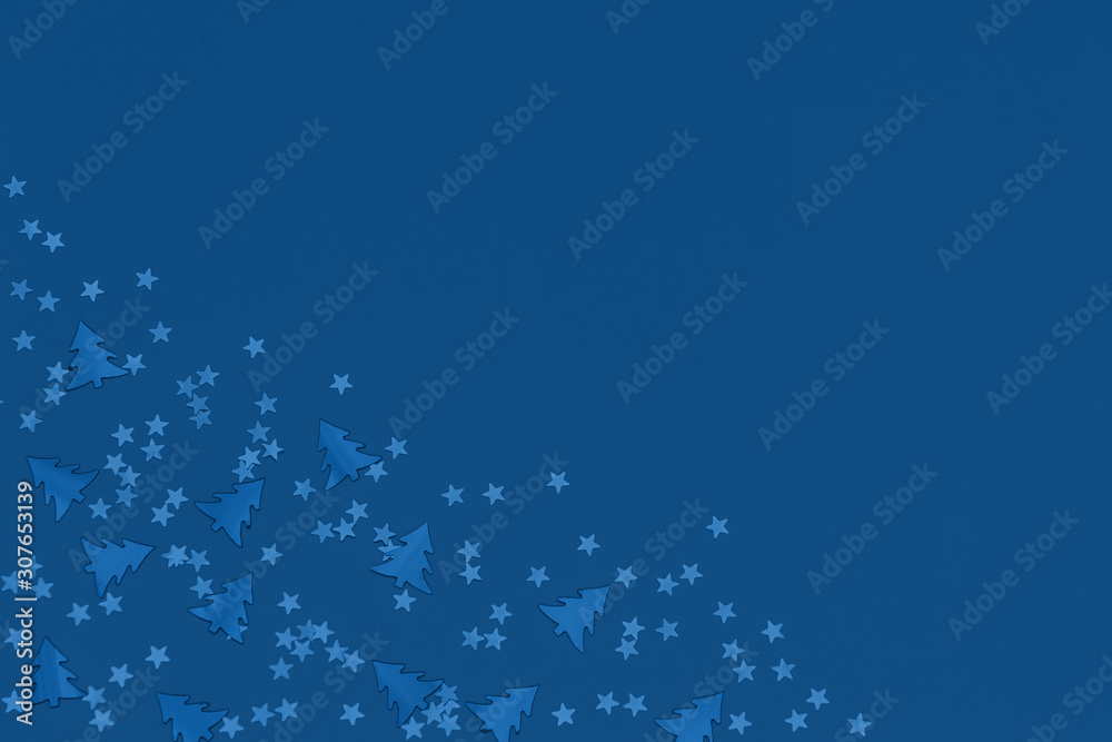 Metallic foil christmas trees and stars confetti sparse on trendy blue background. Simple holiday color trend concept. Corner frame, copy space. Winter festive backdrop. Top view, flat lay.