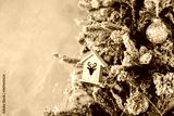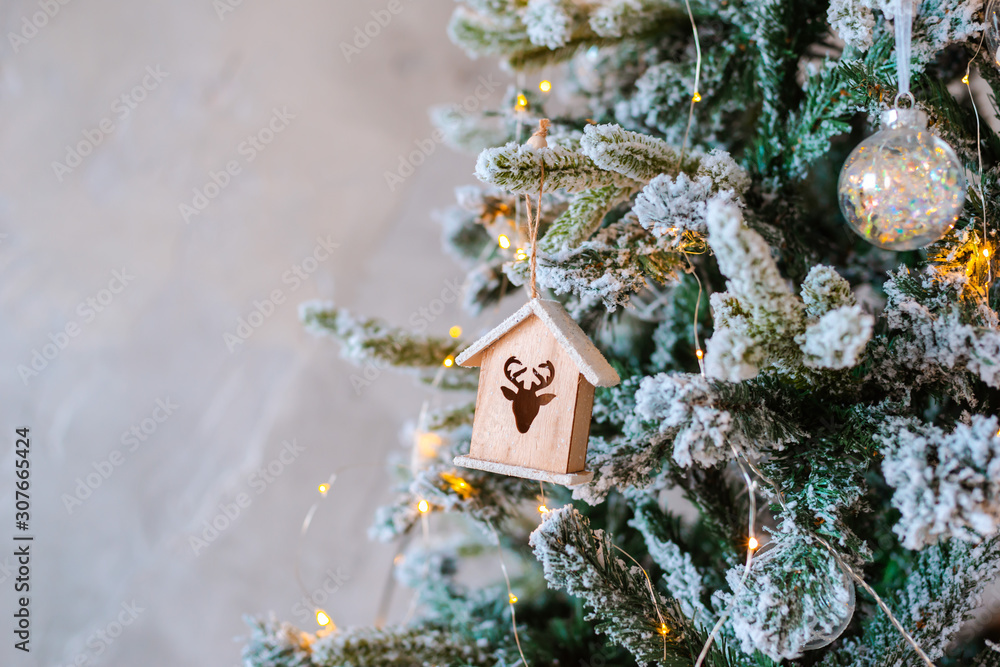 Decorated snow-covered Christmas tree close-up. Wooden toy house and illuminated garland with lanterns.