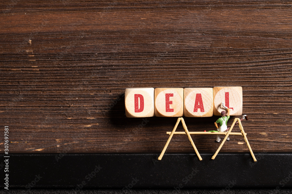 little painter figure and wooden blocks with the word "deal" on wooden background