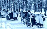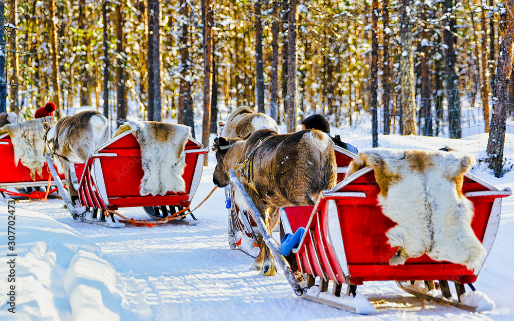 People on Reindeer sleigh in Finland in Rovaniemi at Lapland farm. Family on Christmas sledge at winter sled ride safari with snow Finnish Arctic north pole. Fun with Norway Saami animals.