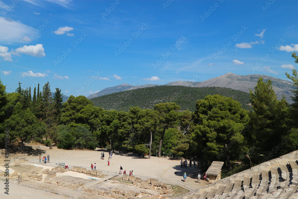 Scenery view to mountains and hills of Greece from the top of ancient theatre of epidaurus, masterpiece of ancient greek architecture