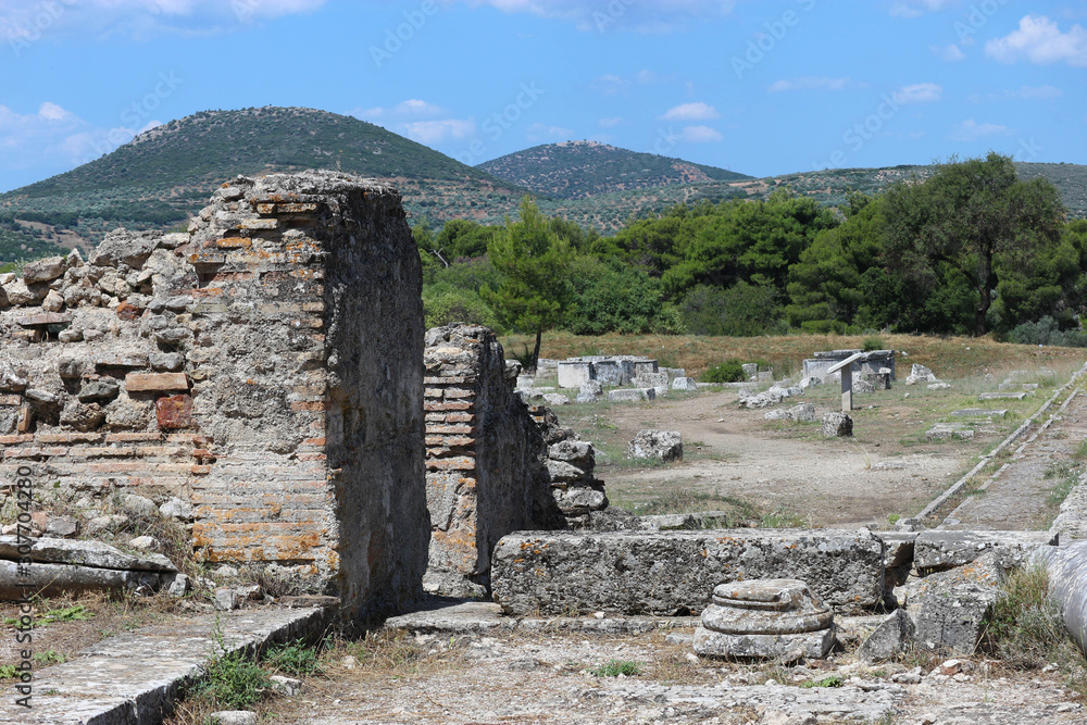 Picturesque ruins of ancient greek city Epidaurus, Peloponnese, Greece with mountains on the background