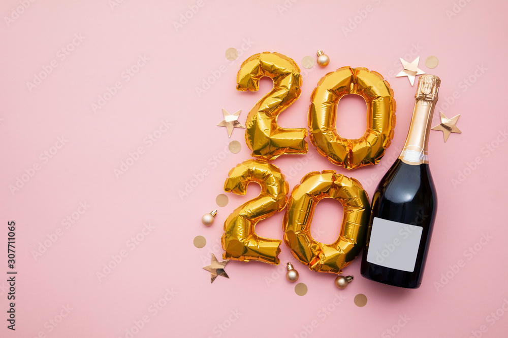 Happy new year 2020 gold celebration balloons with a champagne bottle