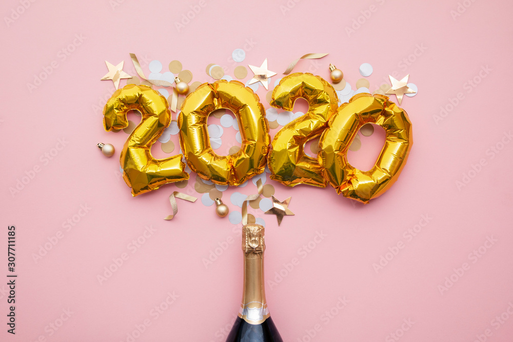 Happy new year 2020 gold celebration balloons with a champagne bottle
