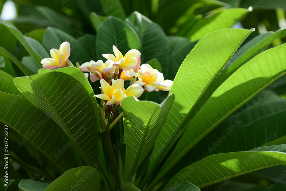 Flowers are blooming In the breeding season Has a green foliage background.white and yellow Plumeria