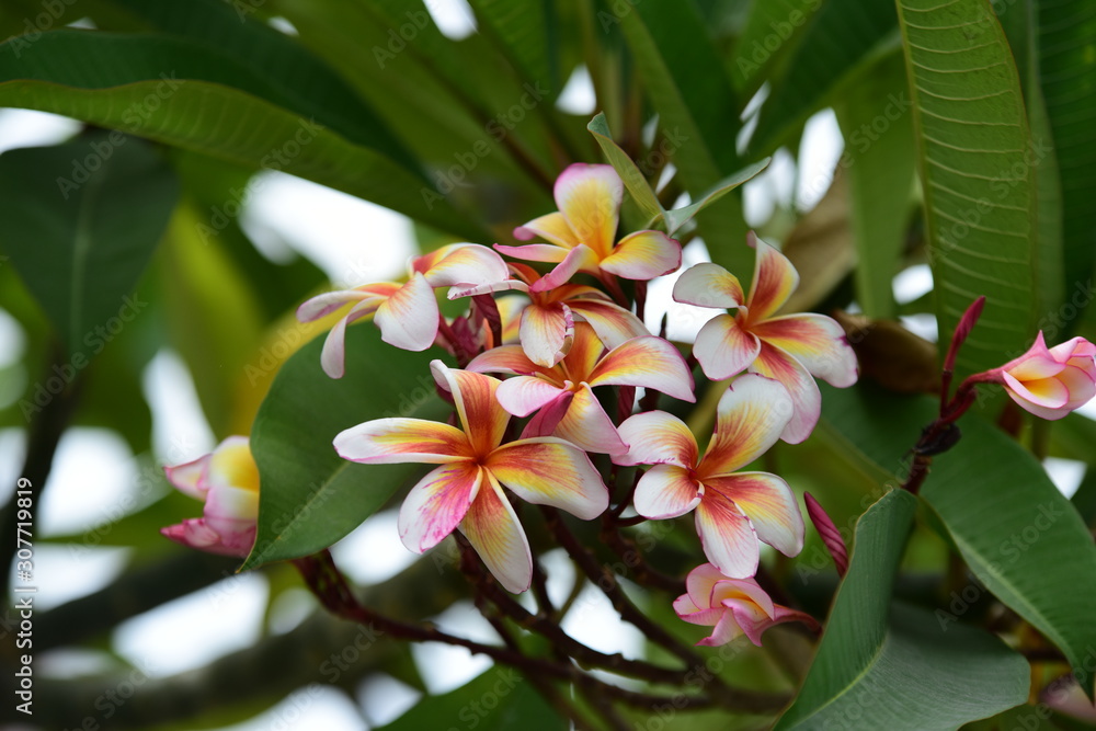Colorful white flowers in the garden. Plumeria flower blooming.