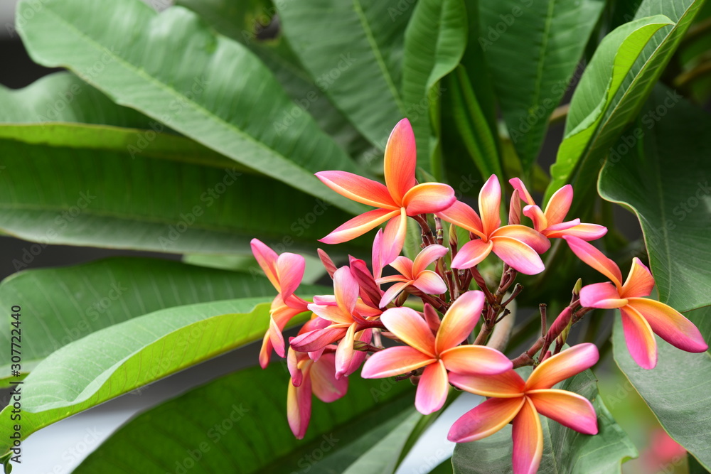 Colorful white flowers in the garden. Plumeria flower blooming.