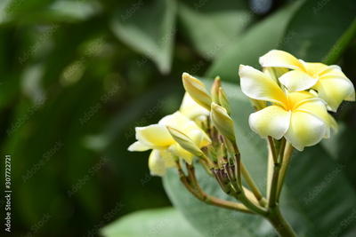 Colorful white flowers in the garden. Plumeria flower blooming.