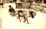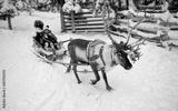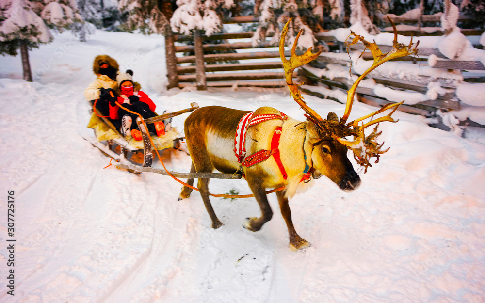 Family on Reindeer sleigh in Finland in Rovaniemi at Lapland farm. Woman and girl on Christmas sledge at winter sled ride safari with snow Finnish Arctic north pole. Fun with Norway Saami animals