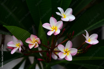 Flowers are blooming In the breeding season Has a green foliage background.white and yellow Plume