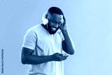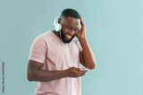 African-American man listening to music on color background