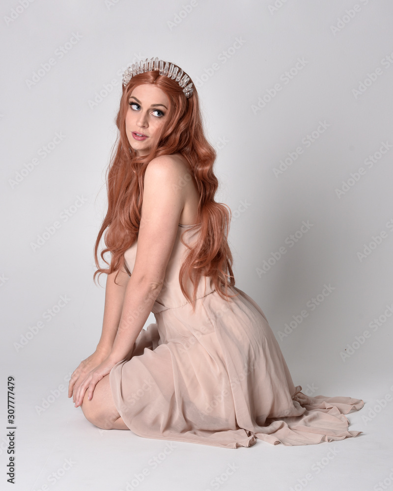 full length portrait of a pretty, fairy girl wearing a nude flowy dress and crystal crown. Seated pose against a grey studio background.