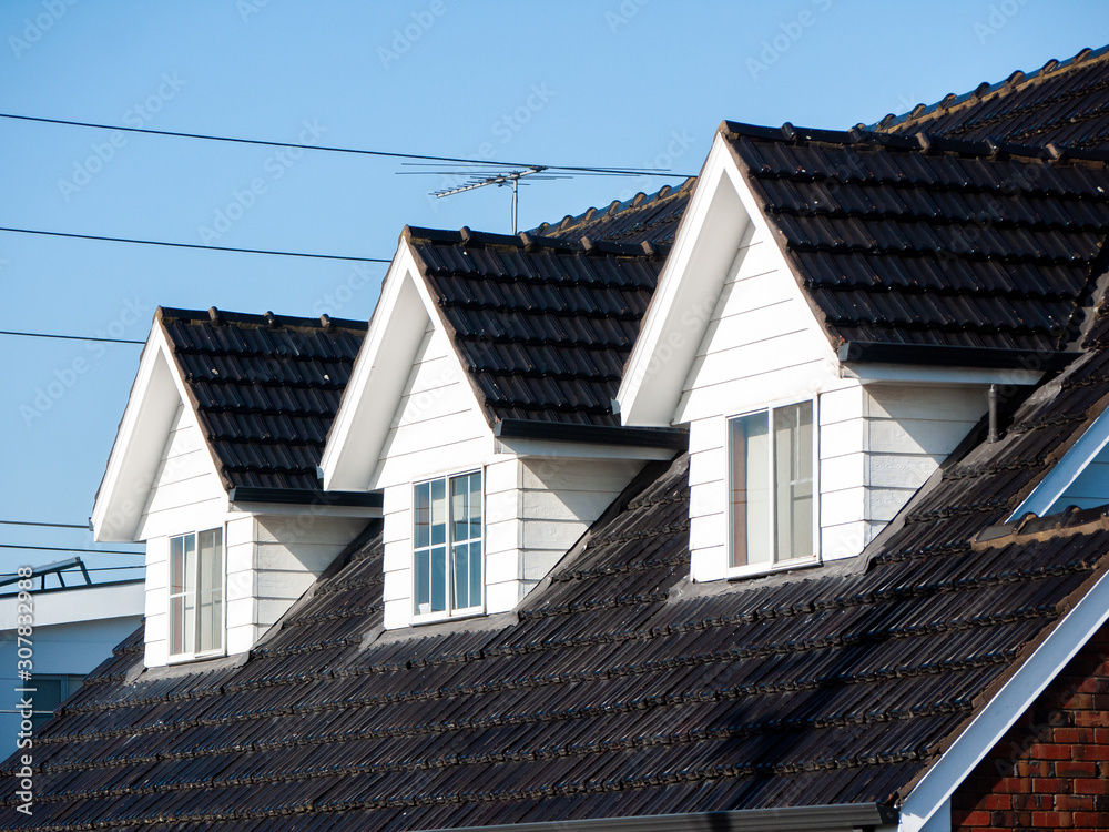 Attic windows on the black tile roof of residential house. Melbourne, VIC Australia.