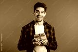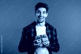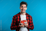 Happy european guy received present. Handsome man holding gift box on blue studio background smiles to camera.