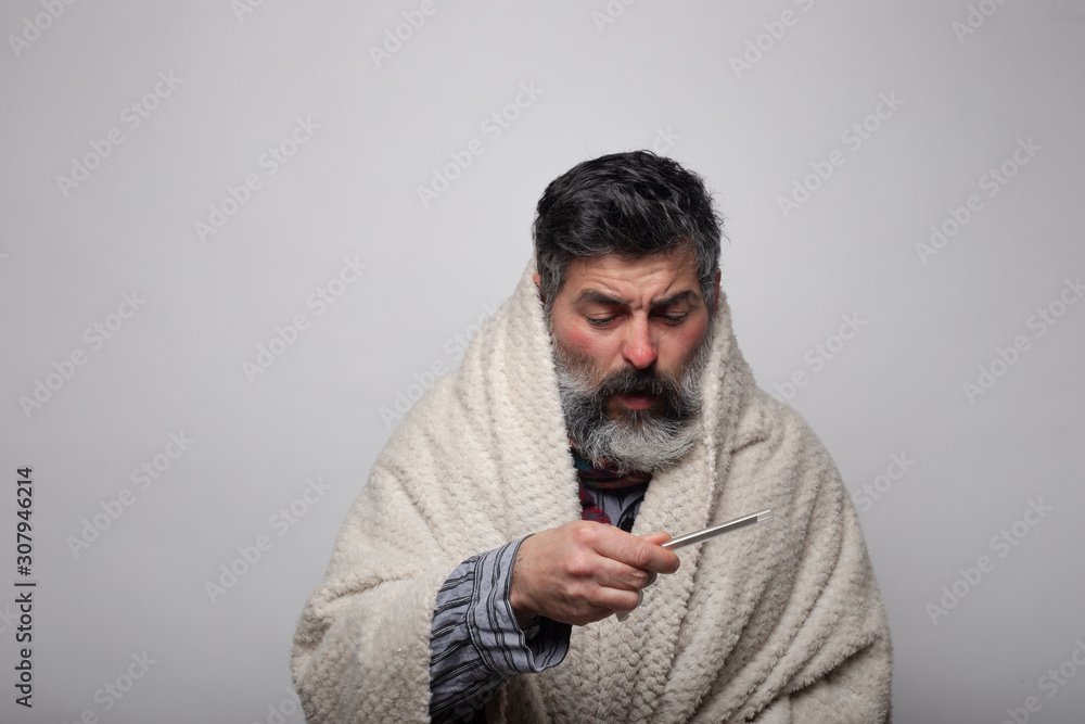Sick mature man looking at the thermometer wrapped in a blanket. health concept.