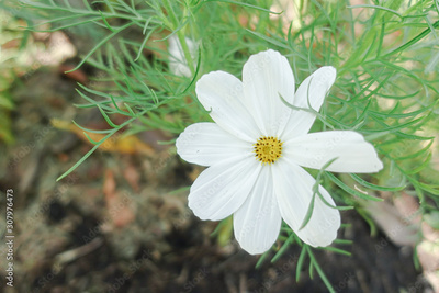 white cosmos with yellow pollen in garden