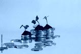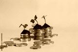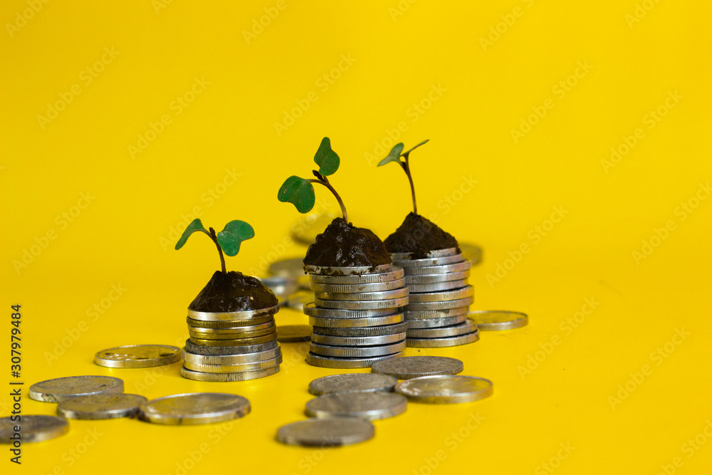 money and coins piled up and on top of it were sprouts from isolated plants on a yellow background