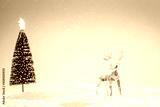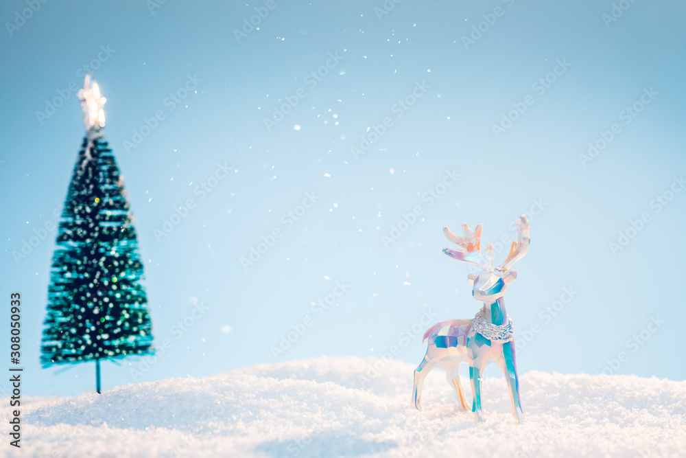 Multicolored polygonal christmas deer in the snow on a light blue sky background. Background Image with copy space