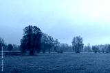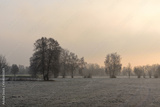 Sunrise with a light morning mist on a wide field with some frost in the winter and trees in the background in Germany