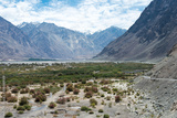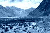 Ladakh, India - Jul 24 2019 - Beautiful scenic view from Between Diskit and Khardung La Pass (5359m) in Nubra Valley, Ladakh, Jammu and Kashmir, India.