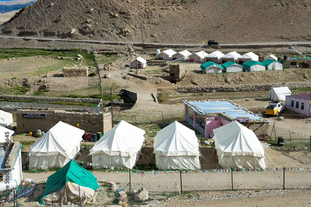 Ladakh, India - Jul 30 2019 - Tourist Camp at Tso Moriri Lake in Changthang Plateau, Ladakh, Jammu and Kashmir, India. It is part of Ramsar Convention - Tsomoriri.