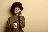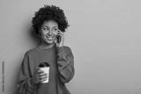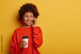 Enthusiastic young Afro girl has phone conversation, speaks with friend and hears funny joke, dressed in casual clothing, drinks aromatic beverage from paper cup looks aside models against yellow wall